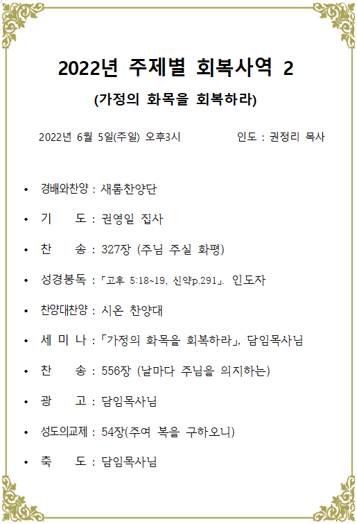 2022 ÁÖÁ¦º° ȸº¹»ç¿ª 2(°¡Á¤ÀÇ È­¸ñÀ» ȸº¹Ç϶ó) À̸§ : ÁÖ»óÀÏ