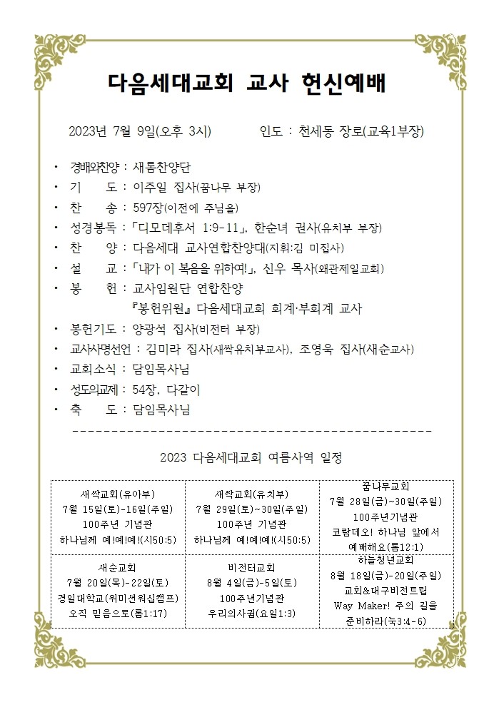 2023 ´ÙÀ½¼¼´ë Àå³â±³È¸ ±³»çÇå½Å¿¹¹è À̸§ : ±èº´¿ì