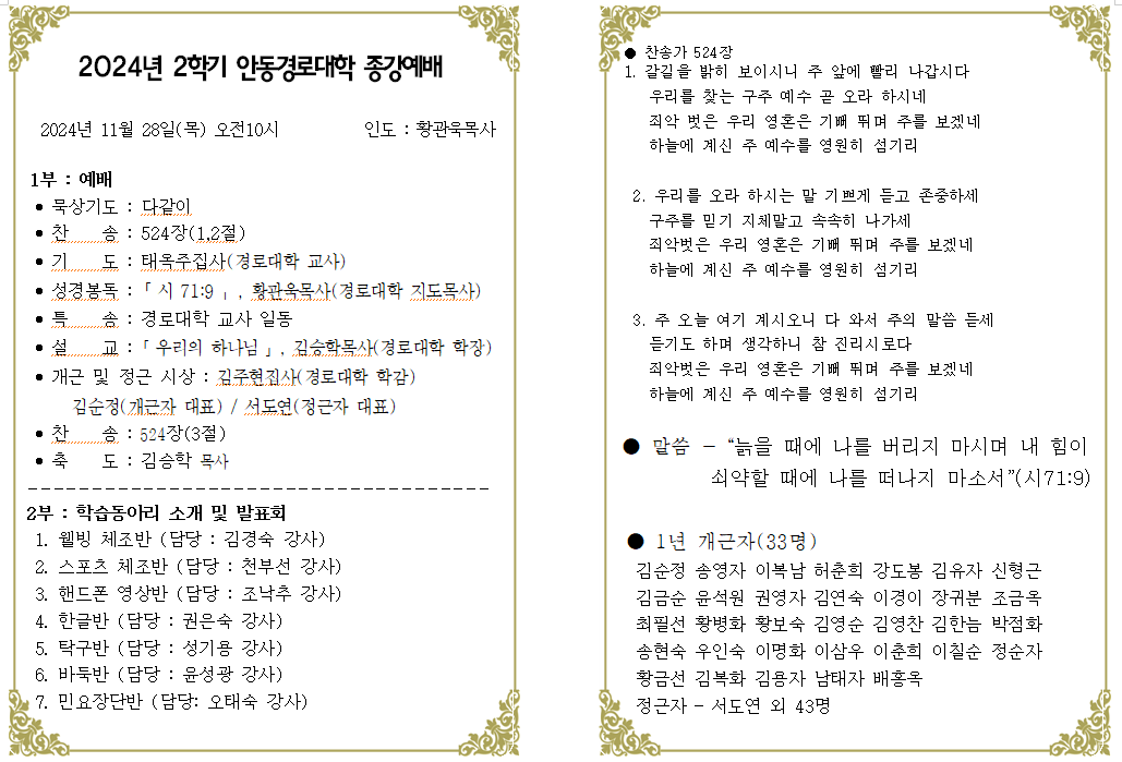 2024³â ¾Èµ¿°æ·Î´ëÇÐ Á¾°­¿¹¹è ¹× ÇнÀµ¿¾Æ¸® ¹ßÇ¥ À̸§ : Ȳ°ü¿í